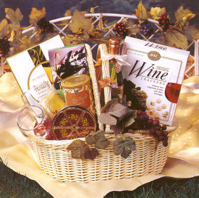 Now romance comes in a basket! Here's everything they'll need for an intimate romantic picnic for two. This lovely natural willow picnic basket contains two wine glasses, sparkling cider, wine crackers, honey roasted peanuts, water crackers, brie cheese, pineapple cake and shortbread cookies. Beautifully accented with grape leaves for a country vineyard touch. |
