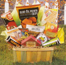 Hurray! Guilt-free snacking is here! Our two-tone country peck basket comes filled with yummy and healthy treats: potato chips made with pure olive oil and sea salt, roasted garlic & herb pretzel nuggets, sparkling guarana berry drink, sparkling citrus drink, ginger sweets, fruit munchies, an energy bar, all-natural cheese straws and more. It's a great, thoughtful gift for people who eat hearty and healthy. |