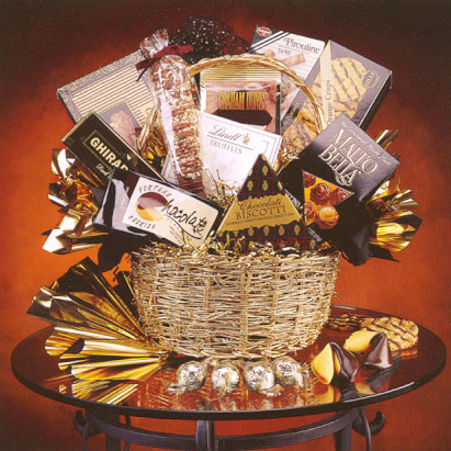 Sophisticated and irresistible. Family, friends and associates will welcome the arrival of this worldly arrangement full of choice gourmet favorites. Includes chocolate dipped hazelnut biscotti, "champagne bubbles", chocolate covered pretzels, gourmet cookies, cheese, crackers and other indulgent treats. A generous family or office gift for any occasion. (Medium Shown)