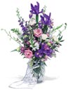Your feelings reach new heights with this tall bouquet. Iris, Snapdragons, Lisianthus, Delphiniums, Orchids and more are festooned with curls of white ribbon. Celebrate! |