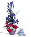Amaze the one you love with a remarkable display of Iris and Carnations. This piece is a birthday wish come true for everyone and is set in a mauve vase. |
