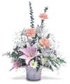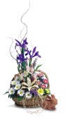 The Easter season is in full bloom with this basket of iris, carnations and lilies. The season comes to life with this bright and cheerful assembly.