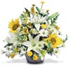 Bright white and sunny yellow Lilies, Snapdragons, Sunflowers, Daisy Poms, Button Poms, Alstroemeria and greenery have a cheery manner. Just try not to smile! |